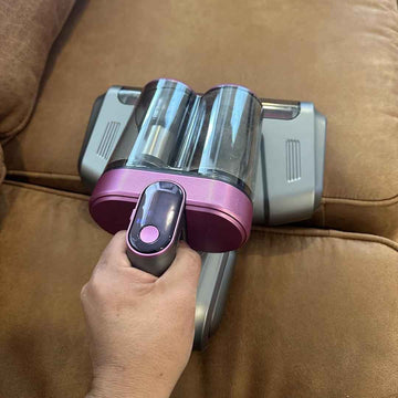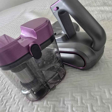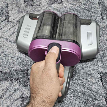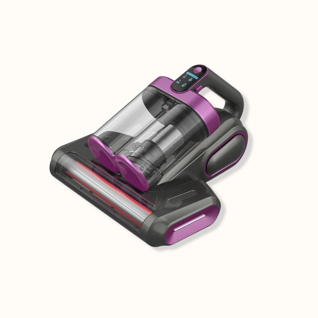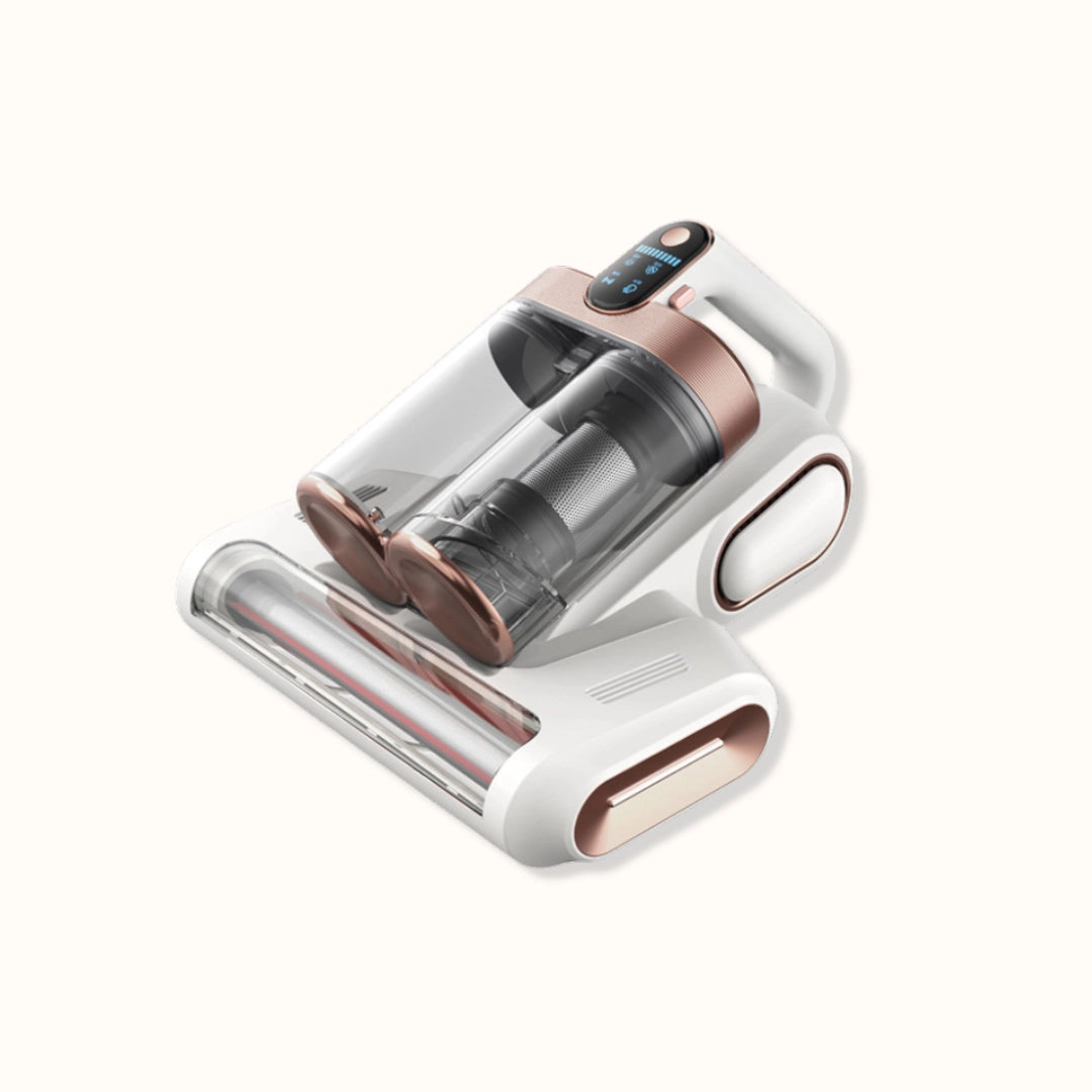 Cordless vacuum cleaner gently cleaning mattress with soft light